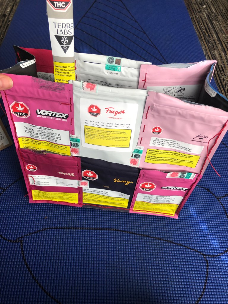 I pulled a large portion of the materials for this bag out the recycling bin found at Buddy’s Place (a local pot shop) in Nelson. The two tapered dube tubes that make the top handles, I got those from a guy in The Valley. The bags were chosen because of their colors and sizes, not because I use or am partial to those brands.