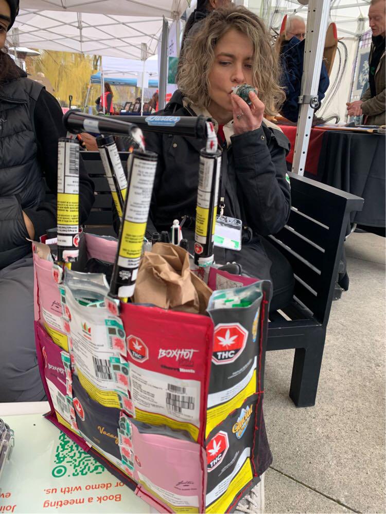 The bag was entered in a family friendly show, making it mildy risque to be potentially showing off cannabis packaging and THC warning labels to children. It didn’t seem to matter in Nelson because the judges accepted it, loved it, and placed it first in the accessories category.